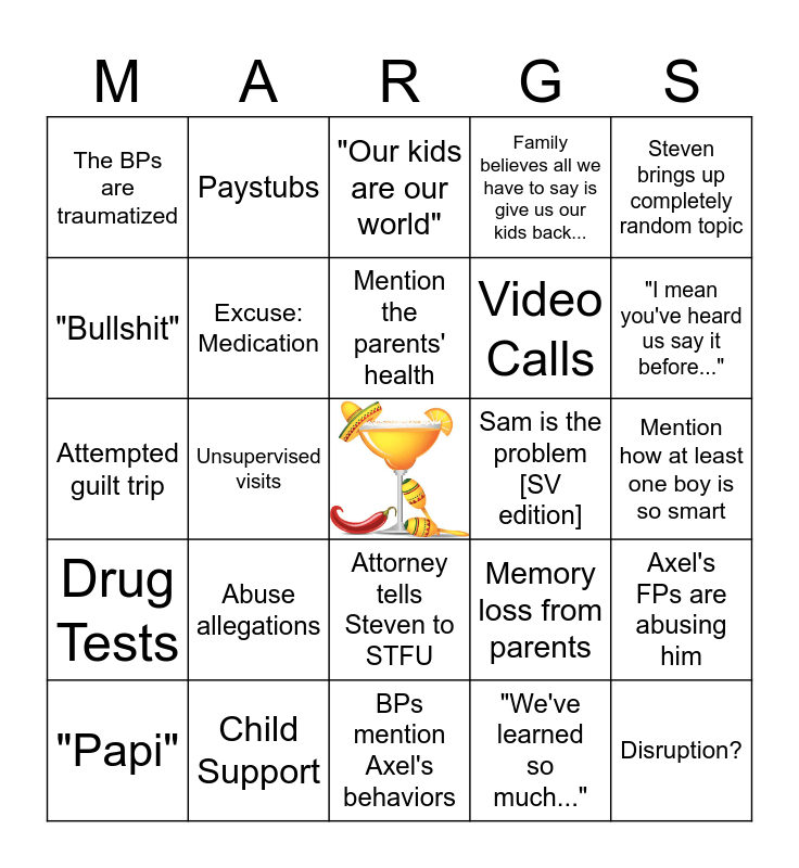 This bingo card has a free space and 33 words: The BPs are the victim, The children are traumatized, Unsupervised visits, BHG, Drug Tests, Excuse: Medication, Steven brings up completely random topic, "Papi", Paystubs, Loss of sibling bond, Mention the parents' health, "Our kids are our world", "Whatever we can do...", Sam is the problem [1x1], Sam is the problem [SV edition], "I mean you've heard us say it before...", Child Support, Attempted guilt trip, Abuse allegations, Memory loss from parents, Attorney tells Steven to STFU, "We've done all you've asked.", The BPs are traumatized, Mention how at least one boy is so smart, BPs mention Axel's behaviors, Disruption?, Family believes all we have to say is give us our kids back..., Video Calls, "Bullshit", Axel's FPs are abusing him, BPs flaunt how "good" their parenting is, "We've learned so much..." and Axel is our sweet but spicy boy.