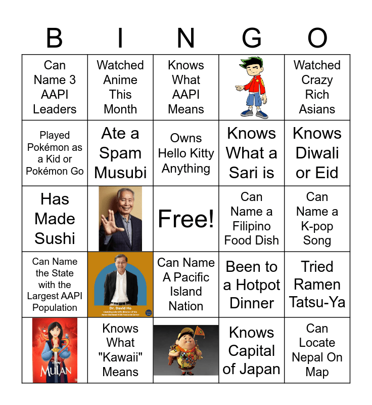 This bingo card has 8 images, a free space and 36 words: Tried Boba Tea, Can Locate Nepal On Map, Made or Ate Sushi, Can Name a K-drama, Knows Capital of Japan, Knows What AAPI Means, Visited an AAPI Country, Watched Crazy Rich Asians, Knows What "Kawaii" Means, Can Name a Filipino Food Dish, Can Name A Pacific Island Nation, Celebrated Lunar New Year, Can Say “Thank You” in Tagalog, Has Made Sushi, Knows What a Hanbok is, Knows Diwali or Eid, Watched Anime This Month, Name a K-pop Group, Has Had Lumpia or Pho Before, Can Name 3 AAPI Leaders, Attended a Lantern Festival, Can Name a K-pop Song, Follows an AAPI Creator, Shared AAPI Post Online, Been to a Hotpot Dinner, Can Name the State with the Largest AAPI Population, Ate at Din Ho BBQ, Tried Ramen Tatsu-Ya, Supported an AAPI-Wwned Austin Biz, Can Name 3 Asian Languages, Owns Hello Kitty Anything, Played Pokémon as a Kid or Pokémon Go, Knows What a Sari is, Can Say “hello” In Korean, Ate a Spam Musubi and Has Tried Kimchi.
