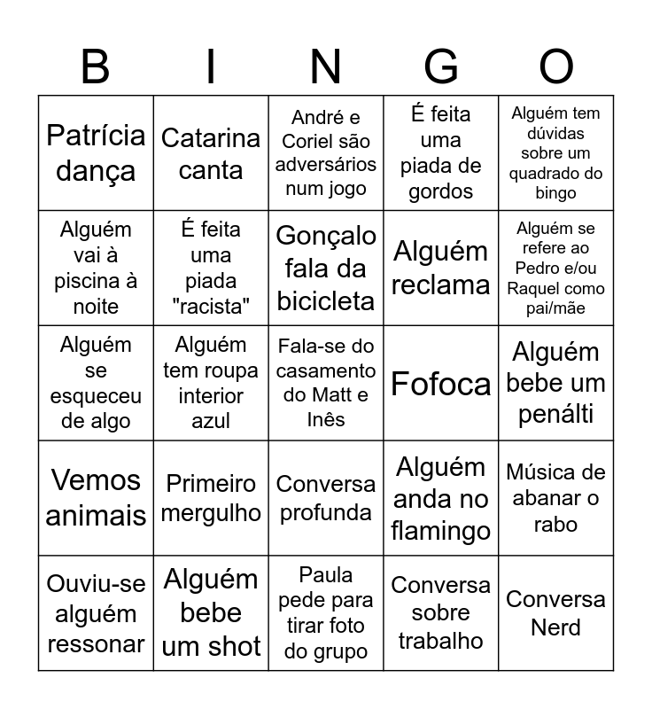 This bingo card has a free space and 24 words: Primeiro mergulho, Alguém bebe um shot, Gonçalo fala da bicicleta, Ouviu-se alguém ressonar, Alguém tem dúvidas sobre um quadrado do bingo, Patrícia dança, Alguém vai à piscina à noite, Catarina canta, Fofoca, Conversa profunda, Alguém reclama, Alguém se esqueceu de algo, Alguém anda no flamingo, Música de abanar o rabo, É feita uma piada "racista", Conversa sobre trabalho, Alguém bebe um penálti, André e Coriel são adversários num jogo, Alguém se refere ao Pedro e/ou Raquel como pai/mãe, Alguém tem roupa interior azul, Conversa Nerd, Vemos animais, É feita uma piada de gordos and Paula pede para tirar foto do grupo.