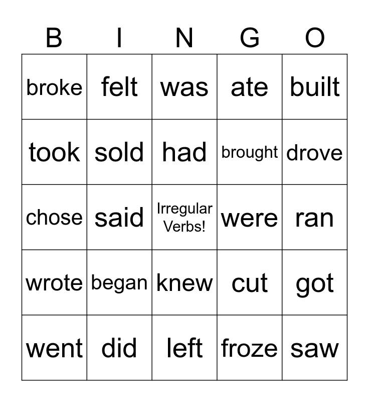 This bingo card has a free space and 29 words: went, drew, said, told, broke, was, sold, began, were, did, ran, saw, left, froze, drove, read, knew, wrote, built, chose, cut, gave, brought, took, ate, felt, got, had and held.