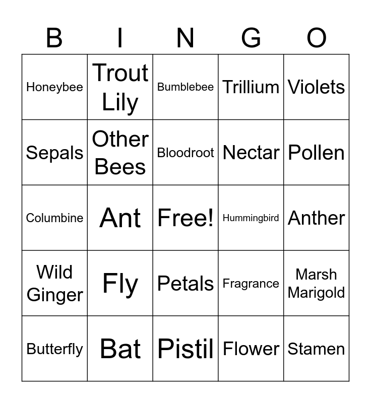 This bingo card has a free space and 29 words: Butterfly, Moth, Ant, Beetle, Honeybee, Bumblebee, Other Bees, Fly, Hummingbird, Bat, Anther, Stamen, Pistil, Flower, Pollen, Seed, Petals, Wild Ginger, Violets, Columbine, Fragrance, Colors, Nectar, Sepals, Trillium, Trout Lily, Marsh Marigold, Bloodroot and Spring Beauty.