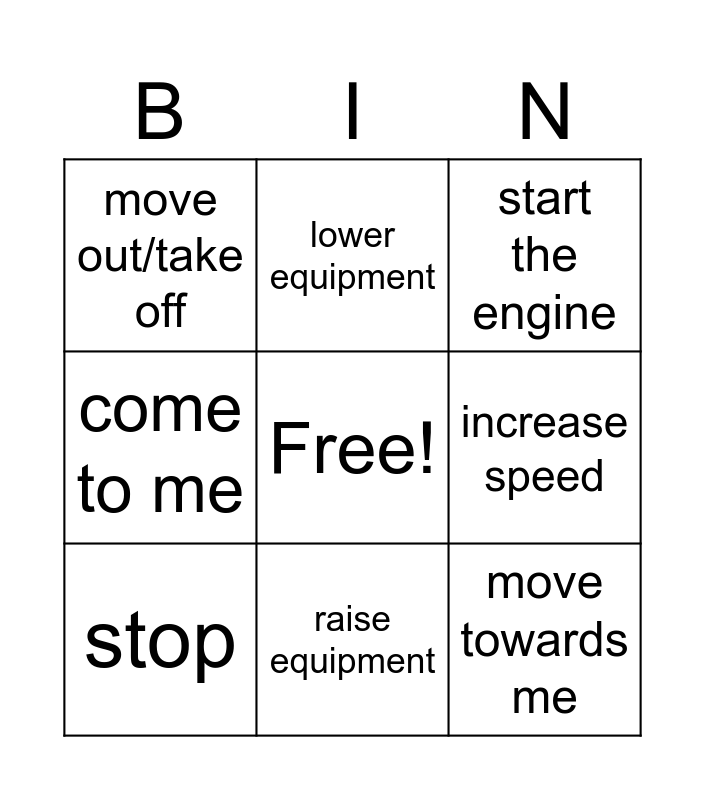 This bingo card has a free space and 11 words: this far to go, raise equipment, move towards me, stop, lower equipment, start the engine, increase speed, decrease speed, come to me, move out/take off and stop the engine.
