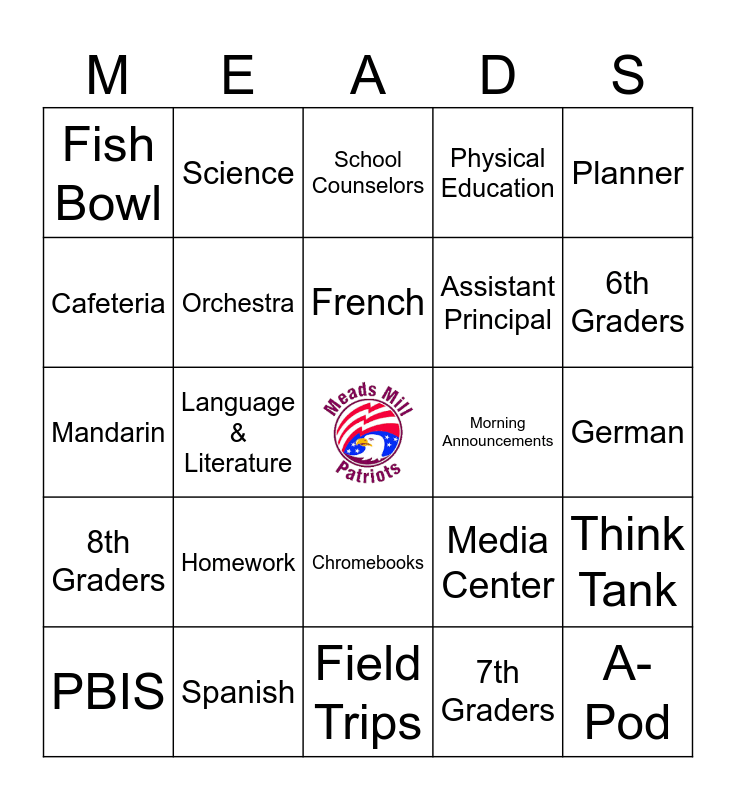 This bingo card has a free space and 30 words: Spanish, Art, Language & Literature, Schoology, Fish Bowl, School Counselors, Orchestra, Chromebooks, Morning Announcements, Field Trips, German, A-Pod, 7th Graders, Lunch Recess, 6th Graders, Band, Media Center, 8th Graders, Homework, Planner, Mandarin, Secretaries, Science, Assistant Principal, Cafeteria, Physical Education, Think Tank, PBIS, French and Individuals & Societies.
