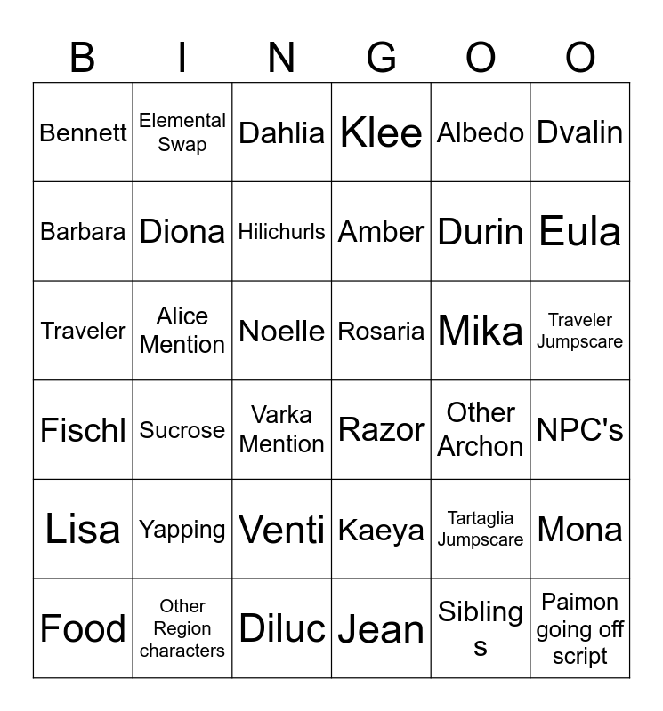 This bingo card has 36 words: Kaeya, Venti, Jean, Barbara, Fischl, Rosaria, Diona, Diluc, Albedo, Tartaglia Jumpscare, Eula, Klee, Mona, Alice Mention, Amber, Bennett, Lisa, Mika, Traveler, Dahlia, Noelle, Sucrose, Razor, Varka Mention, Other Archon, Elemental Swap, Durin, Other Region characters, Hilichurls, Dvalin, Paimon going off script, Food, NPC's, Traveler Jumpscare, Yapping and Sibling s.