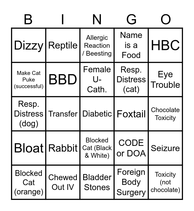 This bingo card has 25 words: Rabbit, Bladder Stones, Female U-Cath., Blocked Cat (orange), HBC, Dizzy, Make Cat Puke (successful), Reptile, Foxtail, Blocked Cat (Black & White), Resp. Distress (cat), Resp. Distress (dog), CODE or DOA, Seizure, BBD, Toxicity (not chocolate), Chocolate Toxicity, Allergic Reaction / Beesting, Eye Trouble, Transfer, Diabetic, Chewed Out IV, Bloat, Name is a Food and Foreign Body Surgery.