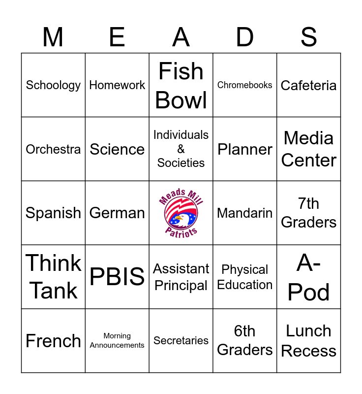 This bingo card has a free space and 30 words: Morning Announcements, Field Trips, German, Language & Literature, Schoology, Fish Bowl, Science, Assistant Principal, Mandarin, Secretaries, 7th Graders, Lunch Recess, 6th Graders, Band, Media Center, 8th Graders, Physical Education, Think Tank, PBIS, Cafeteria, Spanish, Art, Homework, Planner, Orchestra, Chromebooks, A-Pod, French, Individuals & Societies and School Counselors.