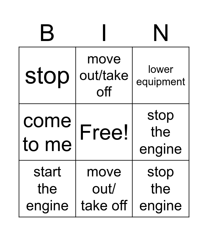 This bingo card has a free space and 11 words: decrease speed, raise equipment, stop the engine, start the engine, lower equipment, stop, move out/ take off, this far to go, come to me, move out/take off and stop the engine.