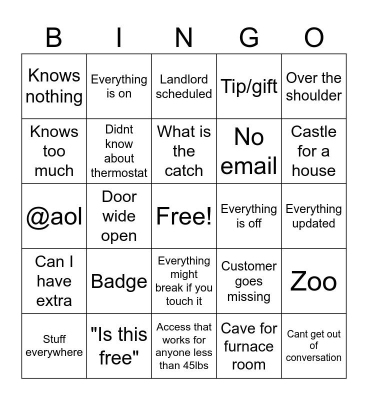 This bingo card has a free space and 24 words: Badge, "Is this free", What is the catch, Stuff everywhere, Over the shoulder, Knows nothing, Knows too much, Everything is on, Everything is off, Everything might break if you touch it, No email, @aol, Customer goes missing, Zoo, Didnt know about thermostat, Cave for furnace room, Everything updated, Landlord scheduled, Castle for a house, Door wide open, Cant get out of conversation, Can I have extra, Tip/gift and Access that works for anyone less than 45lbs.