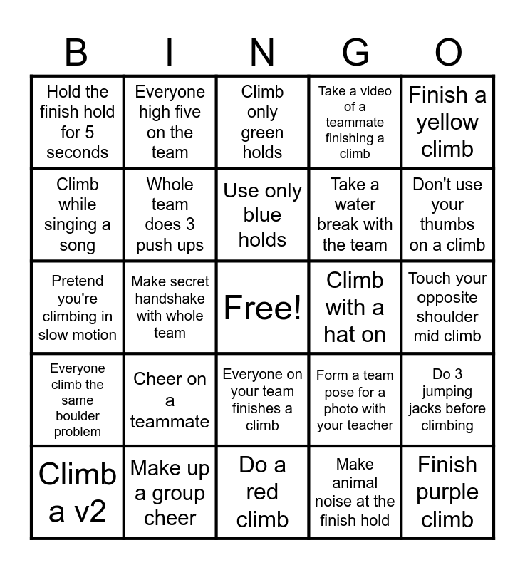 This bingo card has a free space and 24 words: Cheer on a teammate, Make up a group cheer, Use only blue holds, Climb a v2, Finish a yellow climb, Hold the finish hold for 5 seconds, Climb while singing a song, Everyone high five on the team, Climb with a hat on, Everyone on your team finishes a climb, Take a water break with the team, Pretend you're climbing in slow motion, Form a team pose for a photo with your teacher, Do 3 jumping jacks before climbing, Whole team does 3 push ups, Make animal noise at the finish hold, Touch your opposite shoulder mid climb, Climb only green holds, Don't use your thumbs on a climb, Make secret handshake with whole team, Finish purple climb, Everyone climb the same boulder problem, Take a video of a teammate finishing a climb and Do a red climb.