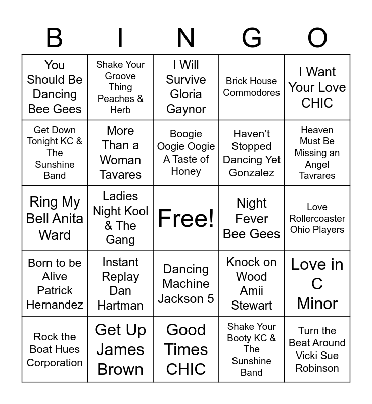 This bingo card has a free space and 76 words: Stayin’ Alive Bee Gees, Le Freak CHIC, I Will Survive Gloria Gaynor, Super Freak Rick James, Funky Town Lipps Inc., Disco Inferno Trammps, I Feel Love Donna Summer, I’m So Excited Pointer Sisters, That’s the Way I Like It KC & The Sunshine Band, Rapper’s Delight Sugarhill Gang, Celebration Kool & The Gang, Hot Stuff Donna Summer, Boogie Oogie Oogie A Taste of Honey, Get Down Tonight KC & The Sunshine Band, The Hustle Van McCoy, Ladies Night Kool & The Gang, Macho Man Village People, Turn the Beat Around Vicki Sue Robinson, Dancing Queen ABBA, I Want Your Love CHIC, Shadow Dancing Andy Gibb, Ring My Bell Anita Ward, More Than a Woman Tavares, Shake Your Groove Thing Peaches & Herb, Brick House Commodores, Got To Be Real Cheryl Lynn, Come To Me France Joli, Boogie Wonderland Earth, Wind, & Fire, Young Hearts Run Free Candi Station, You Sexy Thing Hot Chocolate, Too Hot Kool & The Gang, Car Wash Rose Royce, Voulez Vous ABBA, Knock on Wood Amii Stewart, Heaven Must Be Missing an Angel Tavrares, Haven’t Stopped Dancing Yet Gonzalez, We Are Family Sister Sledge, If I Can’t Have You Yvonne Elliman, Love Rollercoaster Ohio Players, Shake Your Booty KC & The Sunshine Band, Get Up and Boogie Silver Convention, Play That Funky Music Wild Cherry, Desire Andy Gibb, I’m Coming Out Diana Ross, I Need Your Lovin’ Teena Maria, You Make Me Feel Sylvester, Rock the Boat Hues Corporation, You Should Be Dancing Bee Gees, Take Your Time The SOS Band, Disco Duck Rick Dees, Last Dance Donna Summer, Dancing Machine Jackson 5, Never Can Say Goodbye Gloria Gaynor, I Love The Nightlife Alicia Bridges, Fly Robin Fly Silver Convention, Rock Your Baby George McCrae, Makin It David Haughton, Boogie Nights Heatwave, Best of My Love Emotions, Don’t Leave Me This Way Thelma Houston, Instant Replay Dan Hartman, Sing a Song Earth, Wind & Fire, Heaven Must Have Sent You Bonnie Pointer, I’m Your Boogie Man KC & The Sunshine Band, YMCA Village People, September Earth, Wing & Fire, Night Fever Bee Gees, What Am I Gonna Do With You Barry White, Pick Up the Pieces Average White Band, More More More Andrea True Connection, Love in C Minor, Born to be Alive Patrick Hernandez, Get Up James Brown, It’s Raining Men Weather Girls, Good Times CHIC and Bad Girls Donna Summer.