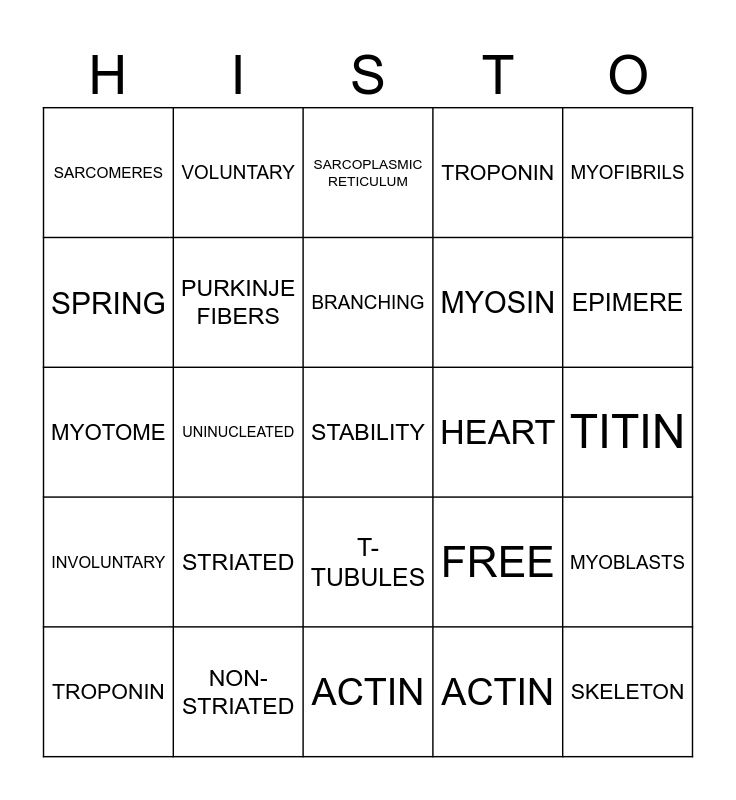 This bingo card has 25 words: STRIATED, ACTIN, BRANCHING, TROPONIN, MYOFIBRILS, SARCOMERES, SPRING, VOLUNTARY, HEART, T-TUBULES, MYOSIN, MYOTOME, FREE, MYOBLASTS, PURKINJE FIBERS, SKELETON, TITIN, SARCOPLASMIC RETICULUM, EPIMERE, UNINUCLEATED, STABILITY, NON-STRIATED, INVOLUNTARY, TROPONIN and ACTIN.