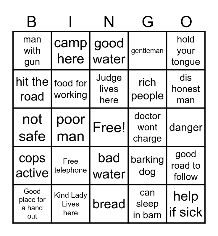 This bingo card has a free space and 24 words: Free telephone, Kind Lady Lives here, Judge lives here, Good place for a hand out, hold your tongue, man with gun, hit the road, camp here, doctor wont charge, bad water, rich people, not safe, barking dog, good road to follow, food for working, can sleep in barn, danger, good water, dis honest man, poor man, help if sick, cops active, gentleman and bread.