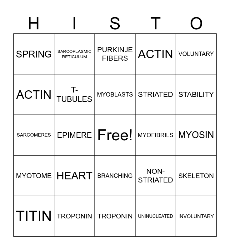 This bingo card has a free space and 24 words: HEART, TROPONIN, MYOBLASTS, TITIN, VOLUNTARY, SPRING, ACTIN, SARCOPLASMIC RETICULUM, MYOFIBRILS, BRANCHING, STRIATED, SARCOMERES, NON-STRIATED, SKELETON, T-TUBULES, UNINUCLEATED, MYOSIN, PURKINJE FIBERS, STABILITY, EPIMERE, INVOLUNTARY, MYOTOME, ACTIN and TROPONIN.