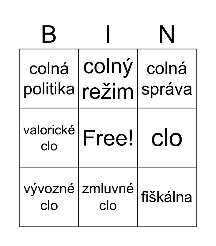 This bingo card has a free space and 8 words: clo, colná správa, colný režim, vývozné clo, colná politika, fiškálna, valorické clo and zmluvné clo.