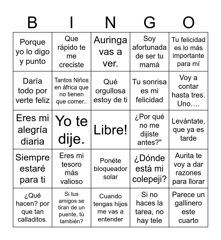 This bingo card has a free space and 30 words: Si tus amigos se tiran de un puente, tú también?, Llévate chompa, va a hacer frío, Yo te dije., Pregúntale a tu papá, Porque yo lo digo y punto, Auringa vas a ver., Tantos Niños en áfrica que no tienen que comer.., Ponéte bloqueador solar, ¿Por qué no me dijiste antes?", Cuando tengas hijos me vas a entender, Levántate, que ya es tarde, Parece un gallinero este cuarto, Si no haces la tarea, no hay tele, ¡Canas! tengo por tu culpa, Voy a contar hasta tres. Uno…., Aurita va venir el borracho y te va a llevar, ¿Dónde está mi colepeji?, Siempre estaré para ti, Eres mi tesoro más valioso, Tu felicidad es lo más importante para mí, Eres mi alegría diaria, Siempre serás mi bebé, Que rápido te me creciste, Tu sonrisa es mi felicidad, Daría todo por verte feliz, Soy afortunada de ser tu mamá, Aurita te voy a dar razones para llorar, ¿Qué hacen? por que tan calladitos., Qué orgullosa estoy de ti and Te amo..