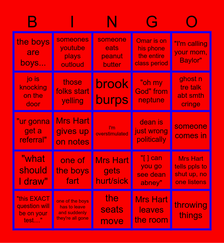 This bingo card has a free space and 37 words: dean n omar talk politics, "I will say this", "in the sense that...", those folks start yelling, Mrs Hart tells ppls to shut up, no one listens, one of the boys fart, brook burps, the lights get turned off, "I'm calling your mom, Baylor", "mih har", Mrs Hart gives up on notes, Omar is on his phone the entire class period, throwing things, someone comes in, jo is knocking on the door, "what should I draw", Madison brings tea or a monster, someone eats peanut butter, Mrs Hart gets hurt/sick, dean is just wrong politically, the boys are boys..., ghost n tre talk abt smth cringe, "this EXACT question will be on your test....", the seats move, mrs Hart crash out, Mrs Hart leaves the room, someones youtube plays outloud, chromebook smoking, dean says something cancellable, fire alarm, Mrs Hart does something that has potential to get her fired, one of the boys has to leave and suddenly they're all gone, "ur gonna get a referral", alani, "[ ] can you go see dean abney", "oh my God" from neptune and "I couldn't really speak on that" and does anyways.