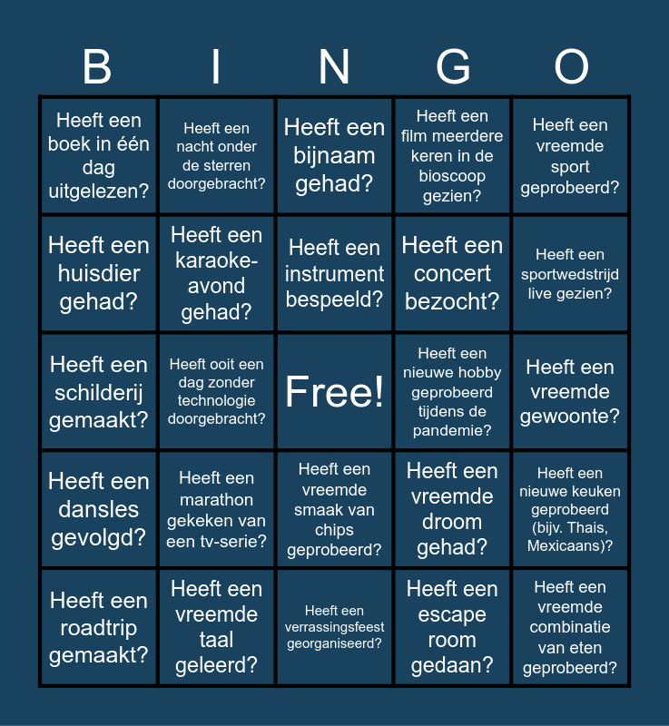 This bingo card has a free space and 24 words: Heeft een marathon gekeken van een tv-serie?, Heeft een vreemde taal geleerd?, Heeft een instrument bespeeld?, Heeft een roadtrip gemaakt?, Heeft een vreemde sport geprobeerd?, Heeft een boek in één dag uitgelezen?, Heeft een huisdier gehad?, Heeft een nacht onder de sterren doorgebracht?, Heeft een nieuwe hobby geprobeerd tijdens de pandemie?, Heeft een vreemde smaak van chips geprobeerd?, Heeft een concert bezocht?, Heeft een schilderij gemaakt?, Heeft een vreemde droom gehad?, Heeft een nieuwe keuken geprobeerd (bijv. Thais, Mexicaans)?, Heeft een karaoke-avond gehad?, Heeft een escape room gedaan?, Heeft een vreemde gewoonte?, Heeft een bijnaam gehad?, Heeft een sportwedstrijd live gezien?, Heeft ooit een dag zonder technologie doorgebracht?, Heeft een vreemde combinatie van eten geprobeerd?, Heeft een dansles gevolgd?, Heeft een film meerdere keren in de bioscoop gezien? and Heeft een verrassingsfeest georganiseerd?.