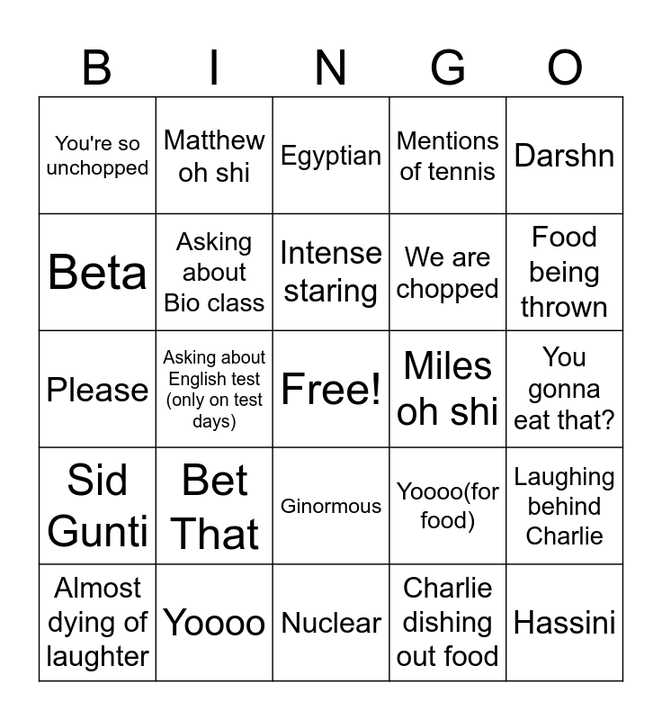 This bingo card has a free space and 24 words: Bet That, Yoooo, Intense staring, Almost dying of laughter, Darshn, You're so unchopped, Beta, Matthew oh shi, Miles oh shi, Ginormous, We are chopped, Please, Yoooo(for food), Laughing behind Charlie, Asking about Bio class, Charlie dishing out food, You gonna eat that?, Egyptian, Food being thrown, Asking about English test (only on test days), Hassini, Sid Gunti, Mentions of tennis and Nuclear.