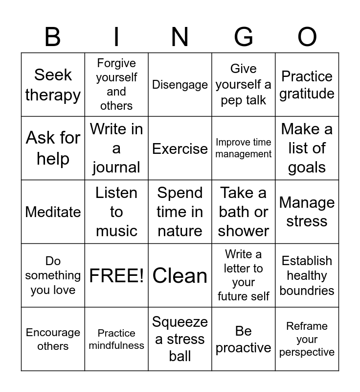 This bingo card has a free space and 40 words: Distract yourself, Meditate, Get Creative, Write in a journal, Practice mindfulness, Clean, Exercise, Practice deep breathing, Practice gratitude, Do something you love, Listen to music, Give yourself a pep talk, Reframe your perspective, Manage stress, Take a bath or shower, FREE!, Focus on problem solving, Seek therapy, Simplify your schedule, Disengage, Establish healthy boundries, Be proactive, Improve time management, Ask for help, Use positive affirmations, Practice self love, Self care, Take a break, Develop a routine, Rest, Spend time with friends, Encourage others, Celebrate all successes both large and small, Write a letter to your future self, Make a list of goals, Squeeze a stress ball, Use a relaxation app, Focus on your needs, Forgive yourself and others and Let yourself cry.
