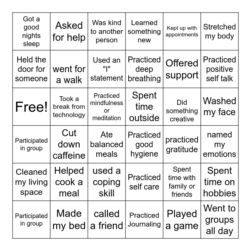 This bingo card has 36 words: Practiced self care, used a coping skill, Practiced Journaling, Held the door for someone, Participated in group, Spent time outside, went for a walk, called a friend, Kept up with appointments, Spent time with family or friends, Practiced positive self talk, Learned something new, Spent time on hobbies, Took a break from technology, Practiced deep breathing, Got a good nights sleep, Cleaned my living space, Did something creative, Free!, Was kind to another person, Practiced mindfulness or meditation, Cut down caffeine, Practiced good hygiene, Ate balanced meals, practiced gratitude, Asked for help, Offered support, Made my bed, Used an "I" statement, Stretched my body, Went to groups all day, Participated in group, named my emotions, Washed my face, Helped cook a meal and Played a game.