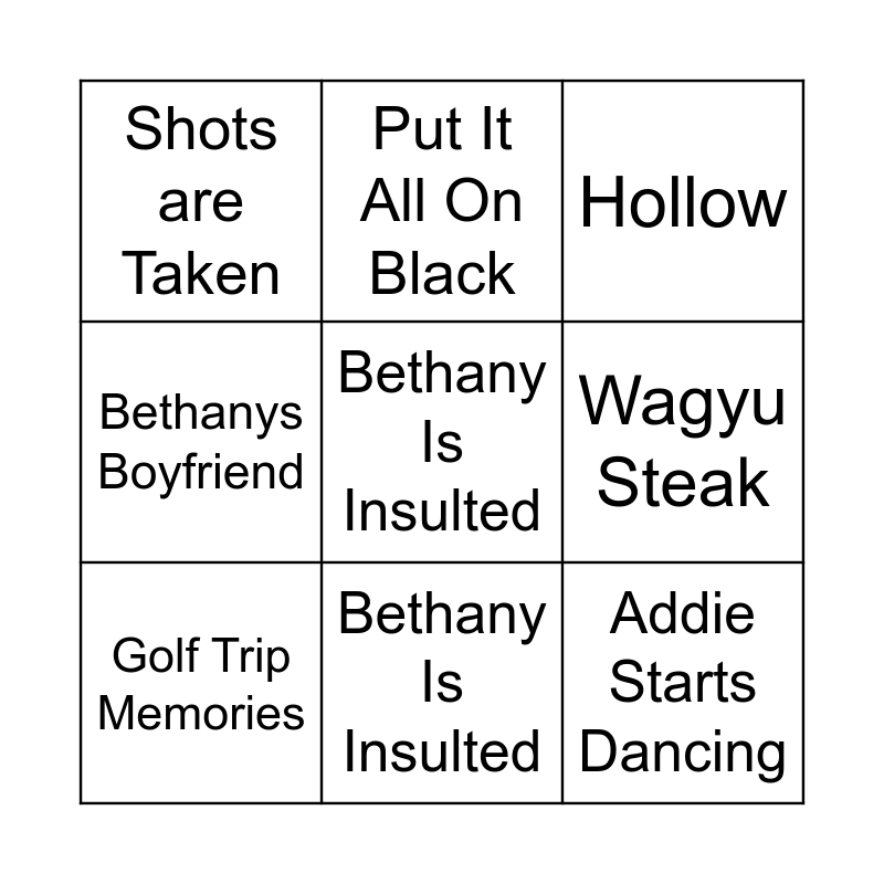 This bingo card has a free space and 9 words: Golf Trip Memories, Hollow, Put It All On Black, Bethanys Boyfriend, Shots are Taken, Wagyu Steak, Addie Starts Dancing, Bingo is Mentioned and Bethany Is Insulted.
