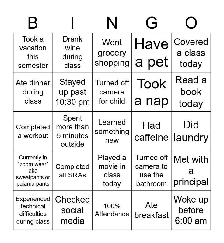 This bingo card has 25 words: Completed all SRAs, 100% Attendance, Turned off camera for child, Experienced technical difficulties during class, Covered a class today, Took a vacation this semester, Ate dinner during class, Drank wine during class, Had caffeine, Played a movie in class today, Took a nap, Completed a workout, Turned off camera to use the bathroom, Met with a principal, Stayed up past 10:30 pm, Woke up before 6:00 am, Did laundry, Went grocery shopping, Read a book today, Spent more than 5 minutes outside, Learned something new, Checked social media, Currently in "zoom wear" aka sweatpants or pajama pants, Have a pet and Ate breakfast.