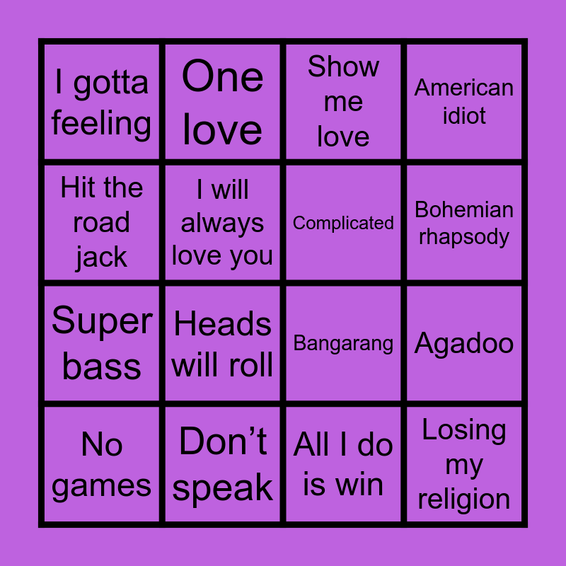 This bingo card has 62 words: Let’s get it started, Just dance, Back in black, Losing my religion, Wannabe, Say my name, Complicated, Dancing on my own, Super bass, Smells like teen spirit, American idiot, Mr blue sky, I will always love you, How to save a life, Man in the mirror, I gotta feeling, No games, Hit the road jack, Paradise city, Bohemian rhapsody, Don’t speak, Show me love, Temperature, Rock DJ, Can you feel the love tonight, Fantasy, I need you, Payphone, Is this the way to Amarillo, Baby one more time, Black or white, How deep is your love, Adore u, Sorry, All I do is win, One love, Sweet caroline, Never gonna give you up, Agadoo, All by myself, Bangarang, Backbone, Nobody to love, Breaking free, Heads will roll, Look what you made me do, Party in the USA, Girl on fire, Red, Best song ever, Like a prayer, Ridin, Cuff it, Bodak yellow, Club can’t handle me, Jump around, Get busy, All star, 21 seconds, Here I go again, Tainted love and Industry baby.