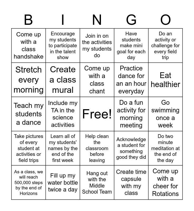 This bingo card has a free space and 24 words: Learn all of my students' names by the end of the first week, Fill up my water bottle twice a day, Come up with a class chant, As a class, we will reach 500,000 steps by the end of Horizons, Do an activity or challenge for every field trip, Come up with a class handshake, Stretch every morning, Encourage my students to participate in the talent show, Do a fun activity for morning meeting, Help clean the classroom before leaving, Practice dance for an an hour everyday, Teach my students a dance, Acknowledge a student for something good they did, Do two minute meditation at the end of the day, Create a class mural, Create time capsule with my class, Go swimming once a week, Join in on the activities my students do, Eat healthier, Include my TA in the science activities, Come up with a cheer for Rotations, Take pictures of every student at activities or field trips, Have students make mini goal for each day and Hang out with the Middle School Team.