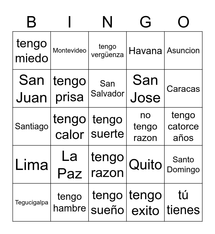 This bingo card has 30 words: tengo hambre, tengo sed, tengo calor, tengo frio, tengo miedo, tengo vergüenza, tengo prisa, tengo razon, no tengo razon, tengo sueño, tengo catorce años, tengo suerte, tengo exito, tú tienes, Caracas, Bogota, Quito, Lima, La Paz, Asuncion, Santiago, Buenos Aires, Montevideo, San Jose, San Juan, Havana, Santo Domingo, Tegucigalpa, San Salvador and Managua.