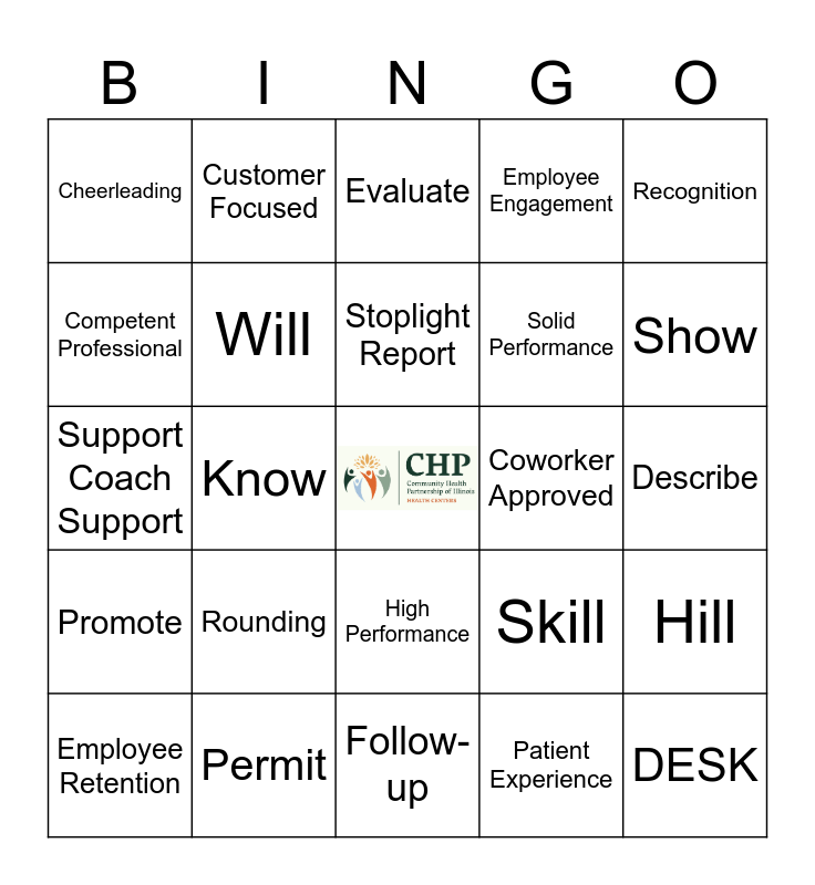 This bingo card has a free space and 25 words: Rounding, Follow-up, Stoplight Report, Employee Retention, Recognition, Cheerleading, Competent Professional, Customer Focused, Coworker Approved, High Performance, Solid Performance, Support Coach Support, Skill, Hill, Will, Low Performance, Describe, Evaluate, Show, Know, DESK, Permit, Promote, Employee Engagement and Patient Experience.