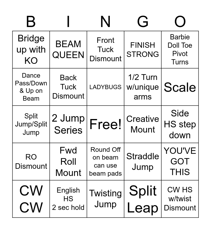 This bingo card has a free space and 29 words: CW CW, Full Turn, 2 Jump Series, FWO or BWO, Bridge up with KO, Front Tuck Dismount, Back Tuck Dismount, Fwd Roll Mount, Creative Mount, English HS 2 sec hold, Side HS step down, CW HS w/twist Dismount, Twisting Jump, Split Leap, Scale, Body Wave, Round Off on beam can use beam pads, RO Dismount, Barbie Doll Toe Pivot Turns, Split Jump/Split Jump, Straddle Jump, 2 skill Acro Series, 1/2 Turn w/unique arms, Dance Pass/Down & Up on Beam, FINISH STRONG, BEAM QUEEN, YOU'VE GOT THIS, LADYBUGS and GGA.