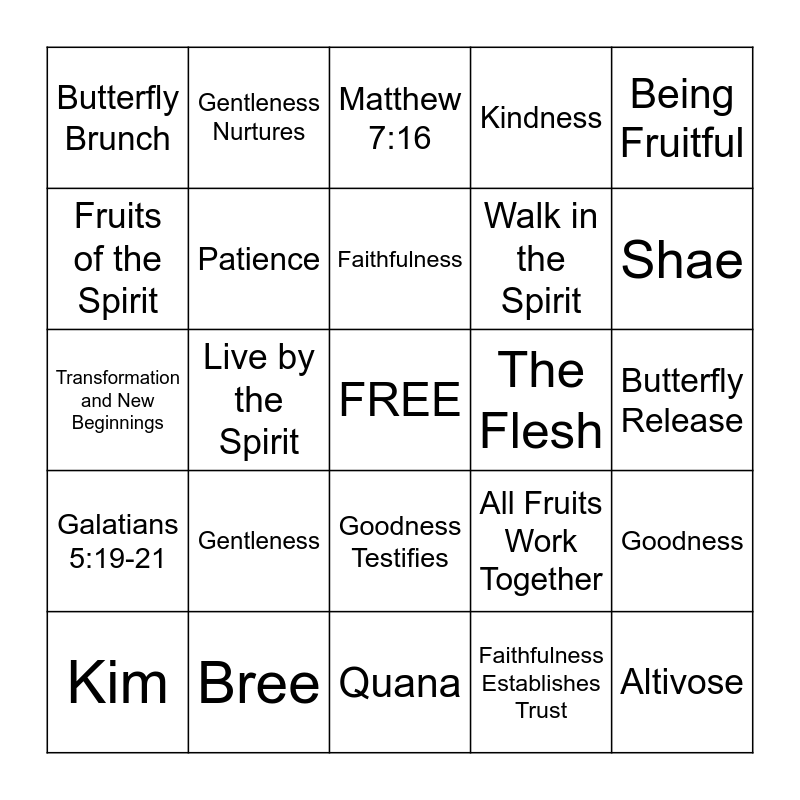 This bingo card has a free space and 38 words: Love, Joy, Peace, Patience, Goodness, Gentleness, Faithfulness, Self-Control, Being Fruitful, Walk in the Spirit, Live by the Spirit, Kindness, Altivose, Butterfly Release, Fruits of the Spirit, Galatians 5:19-21, Galatians 5:22-25, Matthew 7:16, God's Spirit, The Flesh, Butterfly Brunch, Bree, Shae, Kim, Manifestation of the Fruits of the Spirit, Quana, Love is Foundational, Joy Strengthens, Peace Sustains, Patience Refines, Kindness Extends Grace, Goodness Testifies, Faithfulness Establishes Trust, Gentleness Nurtures, Self-Control Disciplines, All Fruits Work Together, Transformation and New Beginnings and Metamorphosis A Powerful Change.