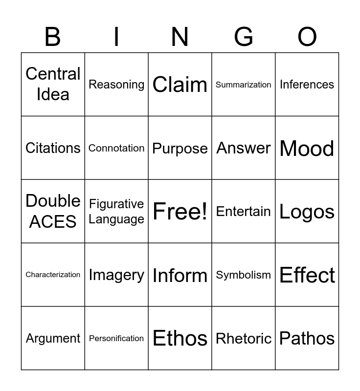 This bingo card has a free space and 30 words: Personification, Metaphor, Figurative Language, Theme, Central Idea, Claim, Connotation, Inform, Entertain, Ethos, Logos, Pathos, Rhetoric, Denotation, Mood, Tone, Symbolism, Characterization, Imagery, Inferences, Double ACES, Evidence, Reasoning, Answer, Citations, Summarization, Effect, Argument, Purpose and Persuade.