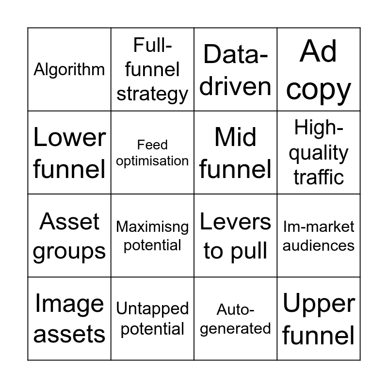 This bingo card has 34 words: Quick wins, Leveraging data, Low-hanging fruit, The marketing funnel, Upper funnel, Mid funnel, Lower funnel, Profitable growth, Full-funnel strategy, Effectively & efficiently, High-quality traffic, Data-driven, Granular structure, Omnichannel presence, Untapped potential, Maximisng potential, Inflating performance, Levers to pull, Month-on-month growth, Under the hood, Audience signals, 1st party data, Algorithm, Auto-generated, Video assets, Image assets, Ad copy, Automated, Asset groups, Feed optimisation, URL expansion, Im-market audiences, 3rd party data and Custom interests.