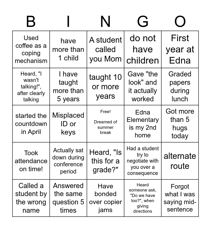 This bingo card has a free space and 29 words: Called a student by the wrong name, I didn't cry today!, Misplaced ID or keys, Your sound didn't work on a video, Used coffee as a coping mechanism, A student called you Mom, I have taught more than 5 years, Actually sat down during conference period, Edna Elementary is my 2nd home, Answered the same question 5 times, Got more than 5 hugs today, Forgot what I was saying mid-sentence, Have bonded over copier jams, Heard someone ask, "Do we have too?", when giving directions, Graded papers during lunch, Smartboard froze during a lesson, Heard, "Is this for a grade?", Took attendance on time!, First year at Edna, started the countdown in April, Had a student try to negotiate with you over a consequence, Received a suspiciously sticky high five, Gave "the look" and it actually worked, Heard, "I wasn't talking!", after clearly talking, do not have children, have more than 1 child, alternate route, taught 10 or more years and first career choice was teaching.