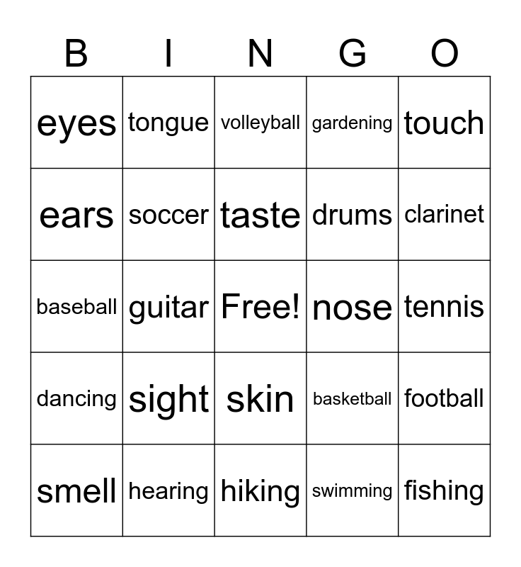 This bingo card has a free space and 24 words: sight, hearing, taste, smell, touch, eyes, ears, tongue, nose, skin, drums, baseball, basketball, football, soccer, swimming, tennis, volleyball, clarinet, guitar, fishing, dancing, gardening and hiking.