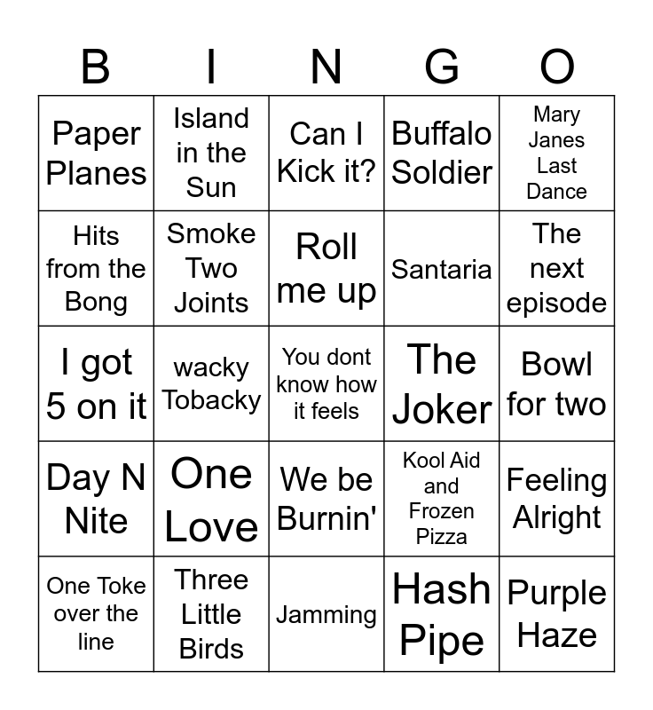 This bingo card has 35 words: Because I got high, Young, Wild and Free, So High, Smoke Two Joints, We be Burnin', Buffalo Soldier, Hits from the Bong, Mary Jane, Roll me up, Blueberry Yum Yum, I got 5 on it, Mary Janes Last Dance, Weed with Willie, Pass the Dutchie, Paper Planes, The Joker, Hash Pipe, wacky Tobacky, Day N Nite, You dont know how it feels, Kool Aid and Frozen Pizza, One Toke over the line, Feeling Alright, Three Little Birds, Can I Kick it?, The next episode, Purple Haze, Puff, the magic dragon, Santaria, Bowl for two, Its all going to pot, Jamming, One Love, Island in the Sun and Comfortably Numb.