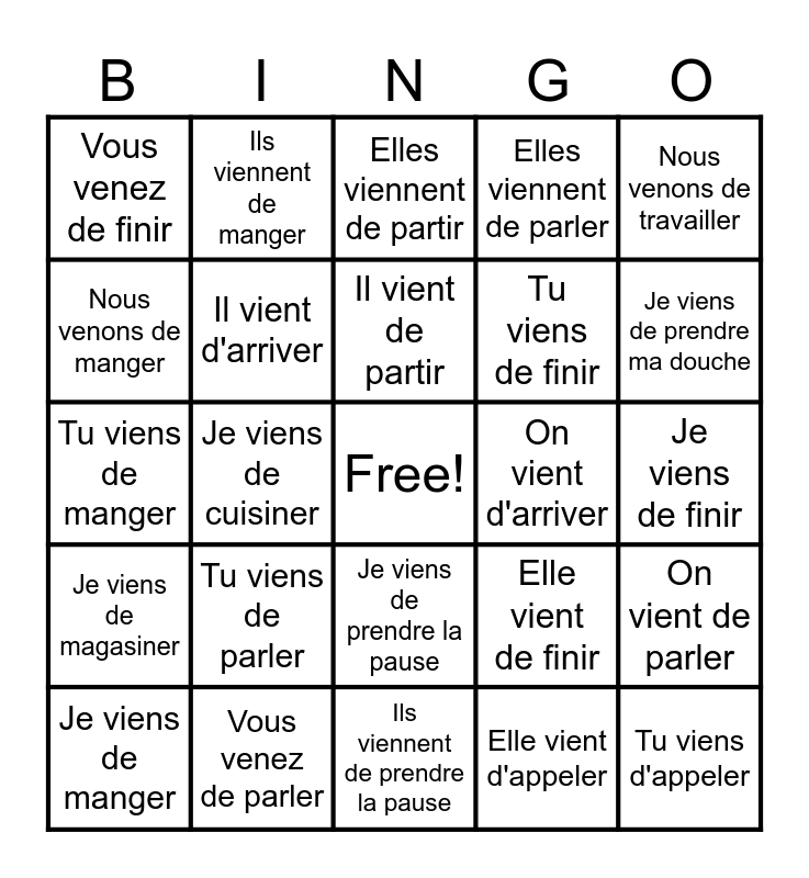 This bingo card has a free space and 24 words: Je viens de manger, Tu viens de parler, Il vient de partir, Elle vient d'appeler, Nous venons de travailler, Vous venez de finir, Ils viennent de manger, Elles viennent de partir, On vient d'arriver, Je viens de finir, Tu viens de manger, Il vient d'arriver, Elle vient de finir, On vient de parler, Nous venons de manger, Vous venez de parler, Ils viennent de prendre la pause, Elles viennent de parler, Je viens de prendre ma douche, Je viens de magasiner, Je viens de cuisiner, Je viens de prendre la pause, Tu viens de finir and Tu viens d'appeler.