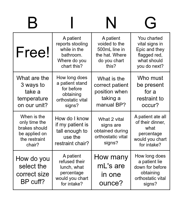 This bingo card has 16 words: How do you select the correct size BP cuff?, A patient refused their lunch, what percentage would you chart for intake?, A patient voided to the 500mL line in the hat. Where do you chart this?, You charted vital signs in Epic and they flagged red, what should you do next?, What are the 3 ways to take a temperature on our unit?, A patient reports stooling while in the bathroom. Where do you chart this?, What 2 vital signs are obtained during orthostatic vital signs?, A patient ate all of their dinner, what percentage would you chart for intake?, Free!, How long does a patient stand for before obtaining orthostatic vital signs?, How many mL's are in one ounce?, Who must be present for a restraint to occur?, When is the only time the brakes should be applied on the restraint chair?, How do I know if my patient is tall enough to use the restraint chair?, What is the correct patient position when taking a manual BP? and How long does a patient lie down for before obtaining orthostatic vital signs?.