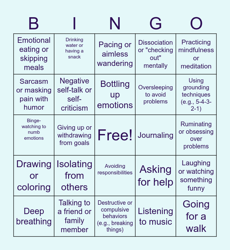 This bingo card has a free space and 24 words: Deep breathing, Isolating from others, Bottling up emotions, Listening to music, Practicing mindfulness or meditation, Emotional eating or skipping meals, Drinking water or having a snack, Pacing or aimless wandering, Journaling, Ruminating or obsessing over problems, Binge-watching to numb emotions, Negative self-talk or self-criticism, Asking for help, Laughing or watching something funny, Sarcasm or masking pain with humor, Talking to a friend or family member, Destructive or compulsive behaviors (e.g., breaking things), Dissociation or "checking out" mentally, Using grounding techniques (e.g., 5-4-3-2-1), Drawing or coloring, Giving up or withdrawing from goals, Avoiding responsibilities, Oversleeping to avoid problems and Going for a walk.