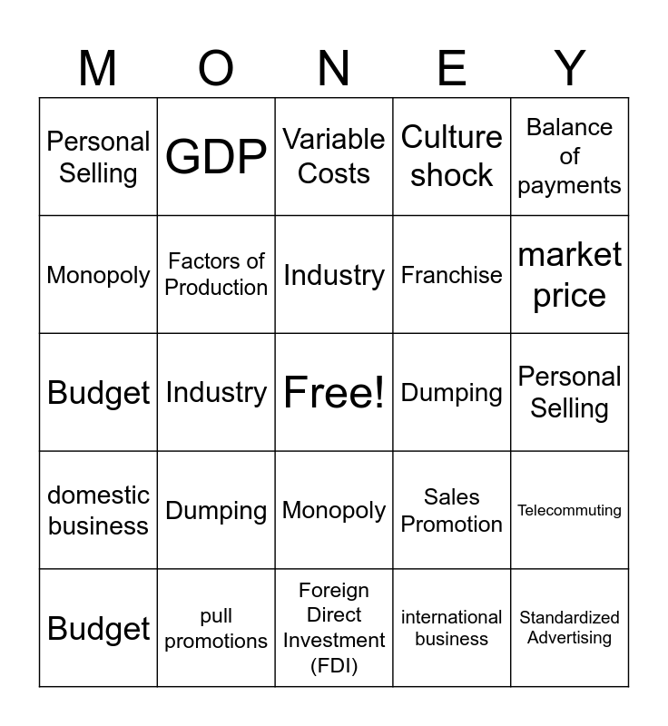 This bingo card has a free space and 61 words: localized advertising, pull promotions, push promotions, domestic business, international business, GDP, Factors of Production, Trade barriers, Franchise, Direct Exporting, Culture shock, Joint venture, Monopoly, Sales promotion, Collectivism, Personal Selling, Standardized Advertising, Balance of payments, Direct barter, Industry, Dumping, Variable Costs, Budget, Telecommuting, economic system, foreign debt, Inflation, infrastructure, market price, localized advertising, pull promotions, push promotions, Domestic Business, International Business, GDP, Culture Shock, Collectivism, Industry, Telecommuting, Budget, Variable Costs, Dumping, Personal Selling, standardized advertising, Sales Promotion, Certificate of origin, Balance of payments, Direct barter, Oligopoly, Monopoly, Foreign Direct Investment (FDI), Franchise, Joint venture, Indirect exporting, Direct exporting, trade barriers, command economy, economic system, Inflation, Infrastructure and market price.