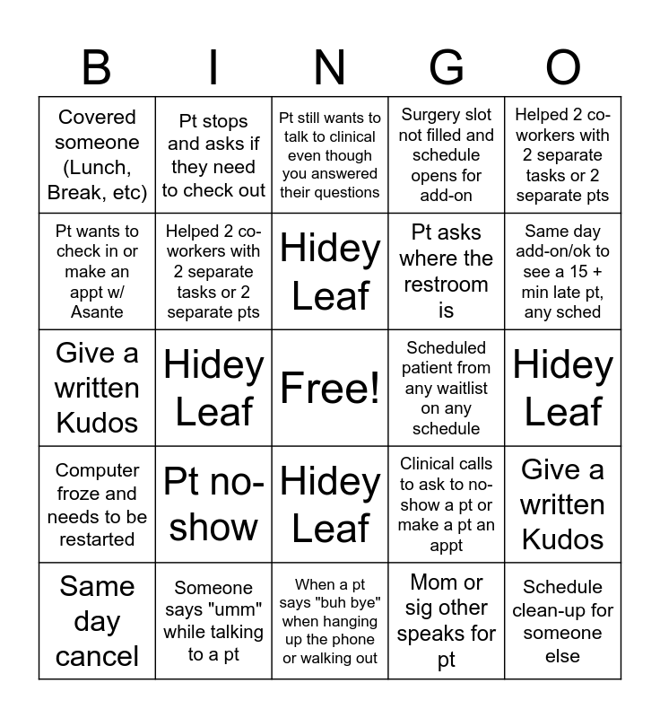This bingo card has a free space and 24 words: Pt no-show, Someone says "umm" while talking to a pt, Hidey Leaf, Same day cancel, Helped 2 co-workers with 2 separate tasks or 2 separate pts, Covered someone (Lunch, Break, etc), Pt wants to check in or make an appt w/ Asante, Pt stops and asks if they need to check out, Scheduled patient from any waitlist on any schedule, Hidey Leaf, Pt asks where the restroom is, Give a written Kudos, Clinical calls to ask to no-show a pt or make a pt an appt, Give a written Kudos, Helped 2 co-workers with 2 separate tasks or 2 separate pts, Mom or sig other speaks for pt, Hidey Leaf, Pt still wants to talk to clinical even though you answered their questions, Same day add-on/ok to see a 15 + min late pt, any sched, Hidey Leaf, Schedule clean-up for someone else, Computer froze and needs to be restarted, Surgery slot not filled and schedule opens for add-on and When a pt says "buh bye" when hanging up the phone or walking out.