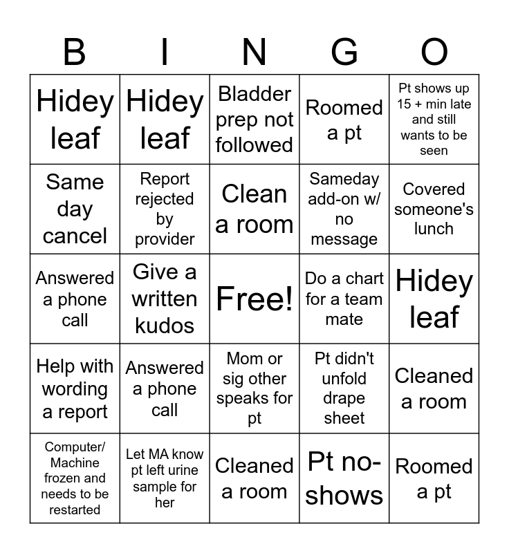 This bingo card has a free space and 24 words: Answered a phone call, Let MA know pt left urine sample for her, Clean a room, Computer/ Machine frozen and needs to be restarted, Pt shows up 15 + min late and still wants to be seen, Hidey leaf, Same day cancel, Hidey leaf, Do a chart for a team mate, Mom or sig other speaks for pt, Sameday add-on w/ no message, Answered a phone call, Pt didn't unfold drape sheet, Cleaned a room, Report rejected by provider, Pt no-shows, Hidey leaf, Bladder prep not followed, Covered someone's lunch, Give a written kudos, Roomed a pt, Help with wording a report, Roomed a pt and Cleaned a room.