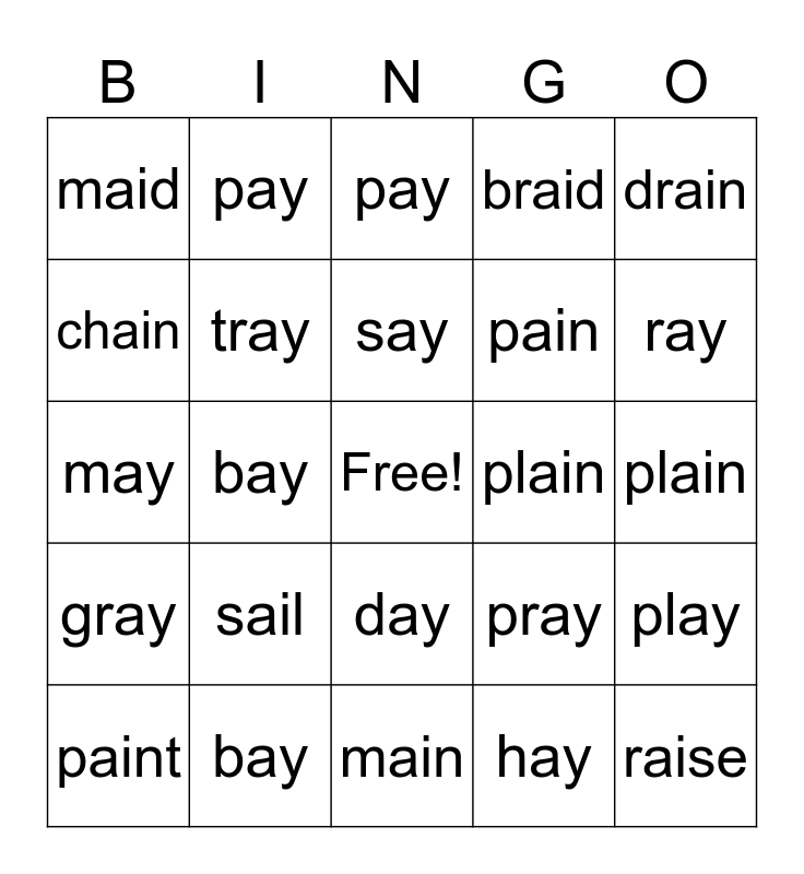 This bingo card has a free space and 24 words: sail, bay, say, paint, drain, maid, chain, pay, plain, day, pain, may, pray, play, tray, hay, plain, pay, ray, bay, raise, gray, braid and main.