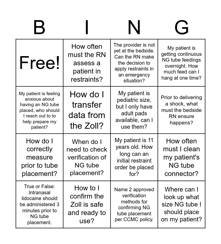 This bingo card has 16 words: True or False: Intranasal lidocaine should be administered 3 minutes prior to NG tube placement., How to I confirm the Zoll is safe and ready to use?, The provider is not yet at the bedside. Can the RN make the decision to apply restraints in an emergency situation?, My patient is getting continuous NG tube feedings overnight. How much feed can I hang at one time?, My patient is feeling anxious about having an NG tube placed, who should I reach out to to help prepare my patient?, How often must the RN assess a patient in restraints?, My patient is 11 years old. How long can an initial restraint order be placed for?, How often must I clean my patient's NG tube connector?, Free!, How do I transfer data from the Zoll?, Name 2 approved verification methods for confirming NG tube placement per CCMC policy., Prior to delivering a shock, what must the bedside RN ensure happens?, How do I correctly measure prior to tube placement?, When do I need to check verification of NG tube placement?, My patient is pediatric size, but I only have adult pads available, can I use them? and Where can I look up what size NG tube I should place on my patient?.