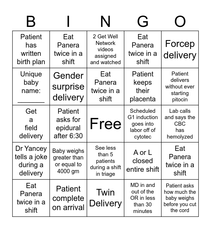 This bingo card has a free space and 29 words: Eat Panera twice in a shift, OB emergency patient is <4cm, Patient asks for epidural after 6:30, White board completely filled out, Patient has written birth plan, 2 Get Well Network videos assigned and watched, Gender surprise delivery, Baby weighs greater than or equal to 4000 gm, Scheduled G1 induction goes into labor off of cytotec, Patient complete on arrival, Lab calls and says the CBC has hemolyzed, Patient asks how much the baby weighs before you cut the cord, Twin Delivery, MD in and out of the OR in less than 30 minutes, Patient delivers without ever starting pitocin, Shift change delivery, See less than 5 patients during a shift in triage, Dr Yancey tells a joke during a delivery, Forcep delivery, Get a field delivery, A or L closed entire shift, Zebra printer battery dead, Patient keeps their placenta, Unique baby name: _______, Eat Panera twice in a shift, Eat Panera twice in a shift, Eat Panera twice in a shift, Eat Panera twice in a shift and Eat Panera twice in a shift.