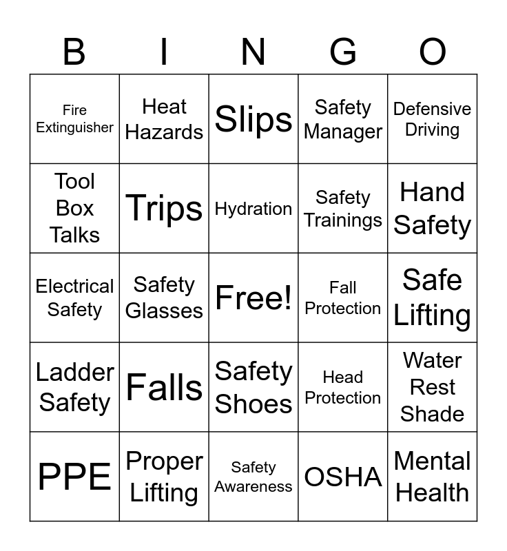This bingo card has a free space and 29 words: PPE, Gloves, Safety Glasses, Hearing Protection, Fire Extinguisher, Slips, Trips, Falls, Fall Protection, Proper Lifting, Safe Lifting, Mental Health, Safety Awareness, OSHA, Hand Safety, Foot Safety, Safety Shoes, Ladder Safety, Defensive Driving, Electrical Safety, Head Protection, Safetyhub, Safety Trainings, Tool Box Talks, Safety Manager, Heat Hazards, Water Rest Shade, Hydration and Follow the Speed Limit.