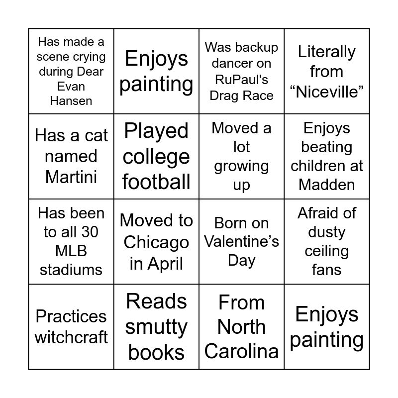 ⚠ This card has duplicate items: Biggest fear is clowns (2), Reads smutty books (2), Has made a scene crying during Dear Evan Hansen (2), Moved a lot growing up (2), Moved to Chicago in April (2), Current MBA student (2), Enjoys beating children at Madden (2), Grew up in Italy (2), Has a cat named Martini (2), Has been to all 30 MLB stadiums (2), Afraid of dusty ceiling fans (2), Literally from “Niceville” (2), Practices witchcraft (2), From North Carolina (2), Played college football (2), Enjoys painting (2), Has worked on an oil rig (2), Was backup dancer on RuPaul's Drag Race (2)