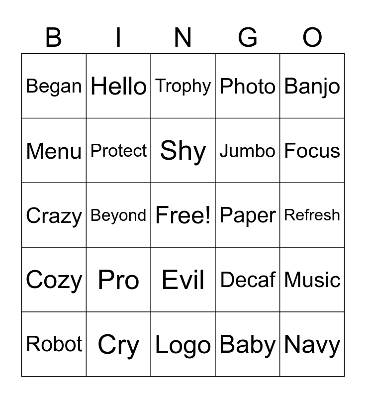This bingo card has a free space and 24 words: Pro, Cry, Shy, Robot, Banjo, Began, Menu, Hello, Paper, Evil, Jumbo, Crazy, Decaf, Music, Protect, Baby, Refresh, Trophy, Focus, Beyond, Navy, Cozy, Photo and Logo.