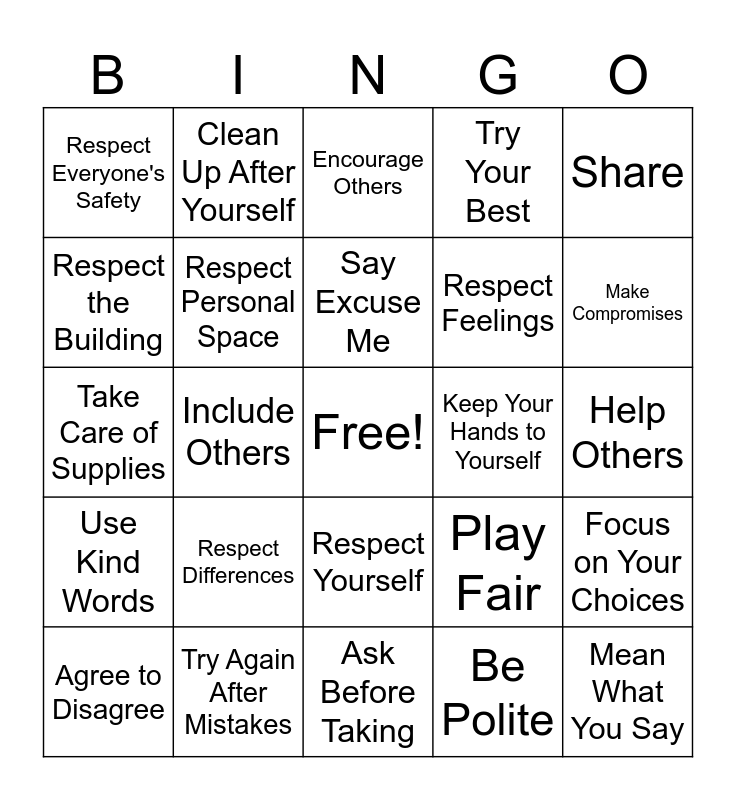 This bingo card has a free space and 33 words: Take Turns, Follow Directions, Include Others, Tell the Truth, Use Kind Words, Respect Personal Space, Share, Agree to Disagree, Clean Up After Yourself, Listen to Others, Say Excuse Me, Encourage Others, Say Thank You, Ask for What You Need, Keep Your Hands to Yourself, Make Compromises, Try Again After Mistakes, Take Care of Supplies, Respect Differences, Play Fair, Respect Yourself, Think Before You Speak, Respect Everyone's Safety, Help Others, Ask Before Taking, Mean What You Say, Try Your Best, Respect Feelings, Respect the Building, Focus on Your Choices, Say Please, Be Polite and Call Others by Their Name.